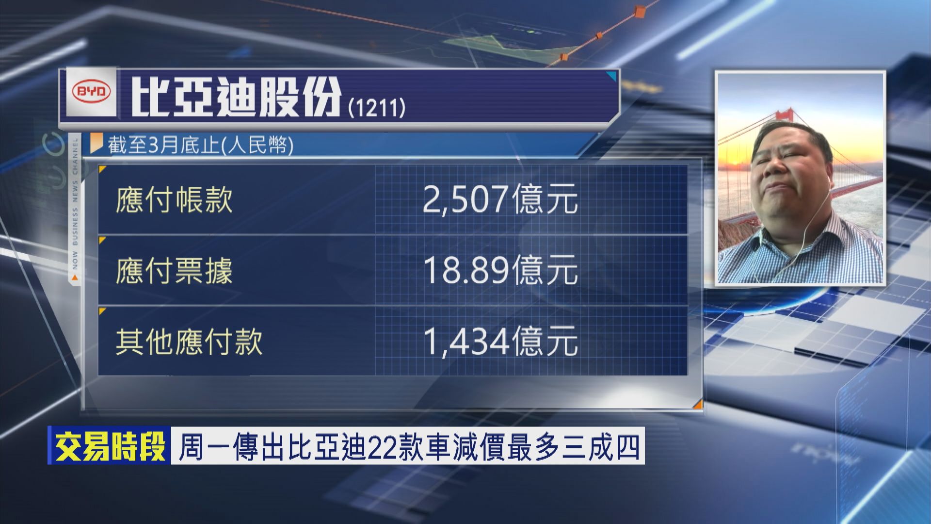 【Now財經台】周一(26日)傳出比亞迪股份(01211)推出「618」優惠,22款車減價最多34%,市場擔心價格戰升級,之後又傳集團山東經銷商爆煲,拖累股價今個星期跌足5日,而長城汽車(02333)董事長魏建軍嘅言論,惹嚟市場揣測比亞迪會唔會變成「恒大2.0」,睇返比亞迪首季業績,負債比率約70%,利潤又跌緊,情況會唔會令人擔心?集團隱性負債似乎亦不少,會唔會影響埋供應商,出現「火燒連環船」嘅情況?