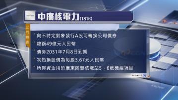 中廣核電力向非特定對象發行總額49億元人民幣A股可轉換公司債券,年期6年,將於2031年7月8日到期,初始換股價每股3.67元人民幣,票面息率逐年遞增,第1年0.2厘,至第6年增至2厘,扣除相關發行費用後,所得資金將用於廣東陸豐核電站5號及6號機組項目。