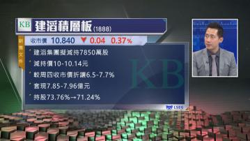 【Now財經台】銷售文件顯示,建滔積層板(01888)大股東建滔集團(00148)擬減持7850萬股,減持價較周四收市價折讓6.5-7.7%。