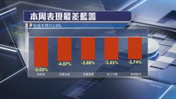 本周表現最差藍籌,依次為海底撈(06862)跌5.05%,信義光能(00968)跌4.07%,信義玻璃(00868)跌3.88%,金沙中國(01928)跌3.85%及華潤置地(01109)跌3.74%。