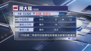此外,摩根大通及摩根士丹利指出,周大福第2季度營運持續有改善,其中,大摩引述管理層指,維持全年指引不變。