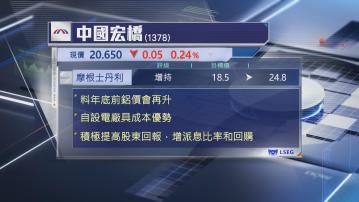 【Now財經台】摩根士丹利上調中國宏橋(01378)目標價34%,並看好鋁價向上,集團具成本優勢,息率亦吸引。