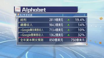 截至6月底止第2季度,Alphabet純利近282億美元,按年增長近20%,整體收入逾964億美元,按年增長14%,高於市場預期的940億美元,期內,Google廣告業務收入約713億美元,按年增長10%,勝預期。
