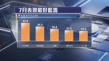 7月表現最佳藍籌,依次為中國生物製藥(01177)升42.9%、藥明康德(02359)升34.3%、石藥集團(01093)升28.8%、藥明生物(02269)升25.5%、中國人壽(02628)升24%。