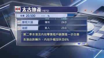 【Now財經台】摩根大通及瑞銀均指出,太古地產(01972)第2季本港及內地零售租戶銷售進一步改善。