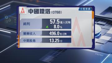 【Now財經台】中國鐵塔(00788)中期純利按年增長8%至逾57.5億元人民幣,收入按年增長2%至約496億元人民幣,派中期息13.25分人民幣。