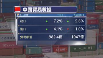 海關總署公布,7月以美元計價出口按年升幅擴大至7.2%,進口則按年升4.1%,市場原本預期轉跌,貿易順差收窄至982.4億美元。首7個月累計,出口升6.1%,但進口跌2.7%,貿易順差逾6800億美元。