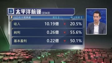 【Now財經台】太平洋航運(02343)上半年純利倒退55.6%,中期息降至1.6港仙。