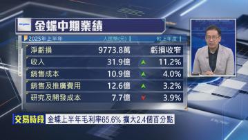 【Now財經台】金蝶國際(00268)昨晚(11日)出咗中期業績,股價今日(12日)急挫,一度大跌8.5%,係表現最弱勢科指成分股。集團中期虧損大幅收窄55%,收入按年增長11%,毛利率擴大2.4個百分點,摩根大通指,金蝶呢份業績係近兩年以來首次好過預期,但點解股價跌到咁,市場收唔收貨?管理層指,今年會強攻東南亞、中東市場,未來人工智能(AI)業務發展及「出海」步伐係咪有望加快?