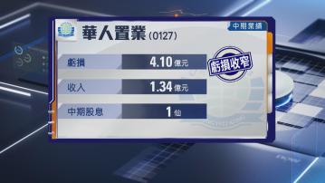 【Now財經台】華人置業(00127)上半年虧損收窄至約4.1億元,去年同期則蝕4.22億元,收入按年跌31%至1.34億元,派中期息0.01元。