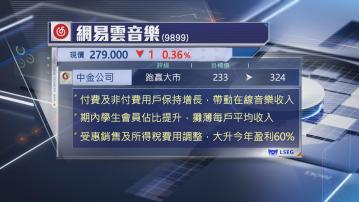 【Now財經台】中金公司大幅上調網易雲音樂(09899)目標價39%,由233元調高至324元,評級「跑贏大市」。