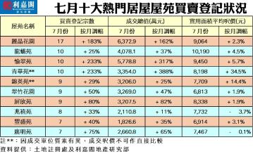 如按屋苑細分,七月份九龍灣麗晶花園按月登記宗數升幅高達1.83倍,以17宗買賣登記拿下上月熱門居屋屋苑榜首之位。至於龍蟠苑、愉翠苑、青華苑以10宗買賣登記攜手佔據亞軍,其中愉翠苑、青華苑上月的登記量均急飆2.33倍成上月升幅最大的屋苑;上述兩個屋苑的成交總額亦大升3.17倍及3.88倍,分別涉資5,778.8萬及3,354萬元。