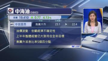 【Now財經台】中信里昂下調中國海洋石油(00883)目標價3%至23.1元,該行指出,雖然面對油價波動及宏觀環境充滿不確定性,但中海油上半年業績反映整體經營狀況大致符合全年目標。