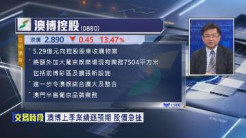 【Now財經台】澳博控股(00880)昨日(28日)出咗業績,上半年虧損擴大,澳博股價今日(29日)重挫,一度瀉逾14%,低見2.85元。此外,摩根大通指,澳博上季市佔率跌至12.3%。到底澳博股價幾時先可以升返上去?市佔率下滑問又點解決?