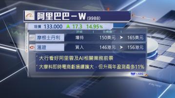 【Now財經台】部分大行上調阿里巴巴(09988)目標價,摩根士丹利上調美股目標價10%至165美元,維持評級「增持」,滙豐證券則上調港股目標價約7%至156元,評級「買入」。