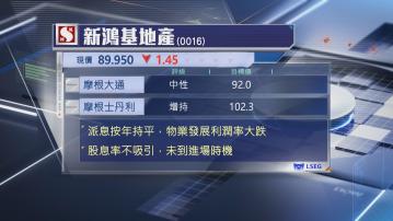 摩根大通指,新地業績沒有驚喜,預期今個財年派息繼續沒有增長。