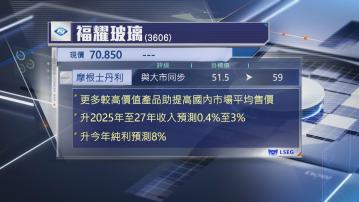 大摩指,福耀在內地汽車市場市佔率達75%,有望透過產品組合升級拓展海外市場,以及發展新的鋁業務提升收入。