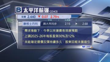 大摩因應運費上升,上調太航今年每股盈利預測30%,明年則上調12%,不過,維持對太航股價前景中性看法,指現時股息及剩餘的回購額帶來的股東回報不算吸引,雖然運費持續上升,明年有機會派特別息或加大回購力度,但展望明年供求回復平衡,未能確定明年運價反彈可持續多久。