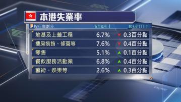按行業劃分,建造業失業率輕微回落,其中,樓房裝飾、修葺及保養失業率跌0.4個百分點,不過,零售業失業率持續向上,餐飲服務活動業更進一步升至6.8%。
