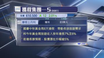 【Now財經台】摩根士丹利看好「十一黃金周」前後公布的旅遊數據,將成為攜程集團(09961)股價主要催化劑。