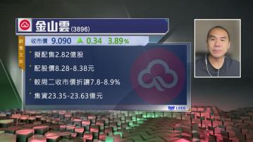 【Now財經台】金山雲(03896)計劃配售2.82億股,銷售文件顯示,配股價介乎8.28-8.38元,較周二收市價折讓7.8-8.9%。