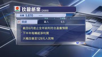 【Now財經台】玖龍紙業(02689)截至6月底止全年,純利按年增長1.35倍,美銀指符合預期,又指下半年度盈利能力顯著改善。