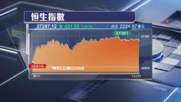 大市今日(2日)高開62點,已見了日內低位,其後升幅急速擴大,更突破27000關,午後最多升526點,高見27381點,繼續見2021年7月以來高位,收市大升431點,收報27287點,連升3個交易日。在北水「缺席」下,大市全日成交縮減至逾2224億元。