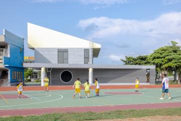 2樓水平結構向兩側外擴,一側與略為轉向的操場跑道斜切成司令台的頂蓋,另一側則作學童戶外活動的露台使用,可東眺火炎山。最吸睛的無疑是office aaa作品中極具辨識度的大片斜屋頂,除擋下大甲強烈的風勢,更進一步與現有校舍共構出集會空間。