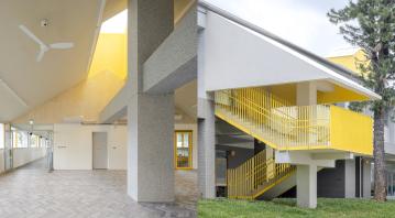 或許因為給孩子的空間,總帶著一抹獨特生機,活潑而蘊藏趣味。本文一起關注設計上具異曲同工之妙的台中市東明國小幼兒園和內埔國小幼兒園,兩者皆由2020年ADA新銳建築特別獎得主、三人團隊office aaa究境聯合建築師事務所操刀,再度活用過去亦曾見於該團隊其他幼兒園項目中的鮮豔黃色,跳脫低調的灰色主體,為建築賦予「柔軟」卻仍有效刺激視覺的外部效果。太陽般輕暖的黃,從外觀到內裝、大處到小角,躍然壁面、樑柱、樓梯、窗框和門框,不僅提供小小朋友生活上適度的引導、無形中對安全的多一分防護,亦讓師長們擁有更清爽明亮的環境耐心推展教育工作。下面讓我們「入境隨俗」地看圖說故事,解析背後建築巧思。