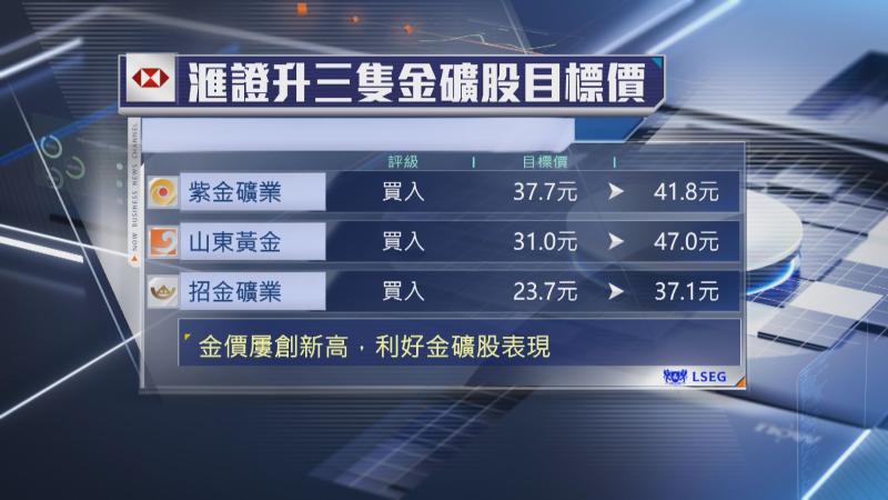 該行指,國際金價創新高,帶動金礦股持續破頂,估計金價每升1%,平均帶動金礦股純利增加2%,上調紫金礦業(02899)、山東黃金(01787)及招金礦業(01818)目標價10%至逾50%,紫金礦業最新看41.8元,山東黃金看47元,招金看37.1元。此外,滙證表示,偏好紫金及山東黃金,兩隻股份目標價均較現價有10%至約20%潛在升幅,3隻股份評級均為「買入」。