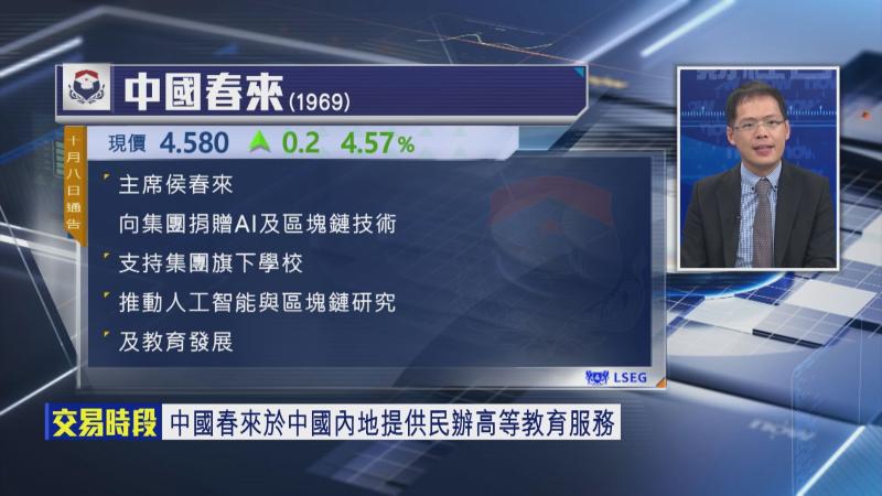 【Now財經台】為內地提供民辦高等教育服務嘅中國春來(01969)昨日(8日)出通告指,主席侯春來向集團捐贈數據中心,支持集團旗下學校推動人工智能(AI)與區塊鏈研究及教育發展,帶動股價今日(9日)升逾5%,高見4.62元,公司未來業務或會使用AI,可唔可以幫到股價同估值?