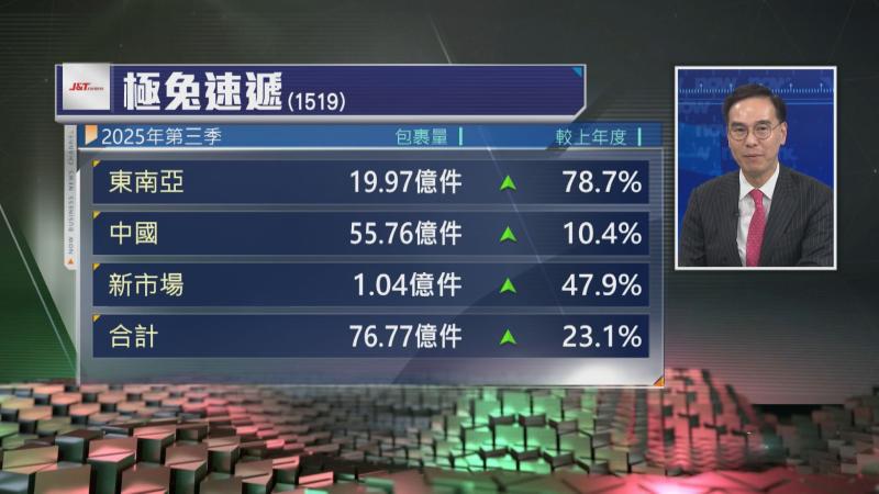 【Now財經台】極兔速遞(01519)第三季包裹量增加23.1%,其中東南亞及新市場分別增加78.7%及47.9%。