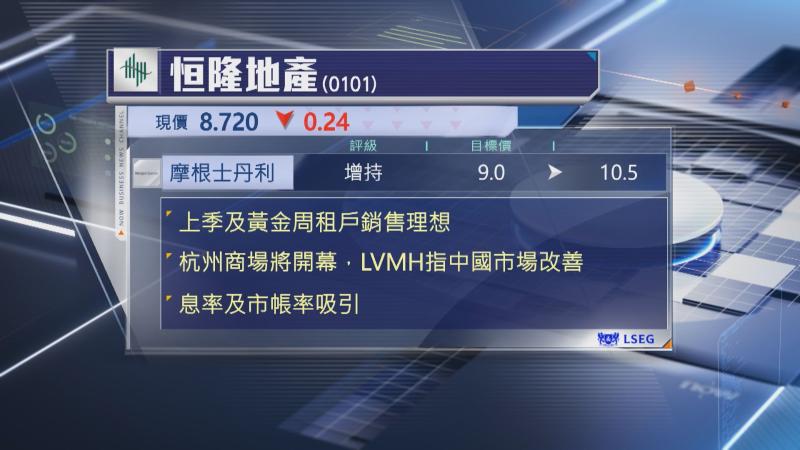 【Now財經台】摩根士丹利表示,恒隆地產(00101)租戶上季及黃金周銷售均有改善,上調集團目標價。