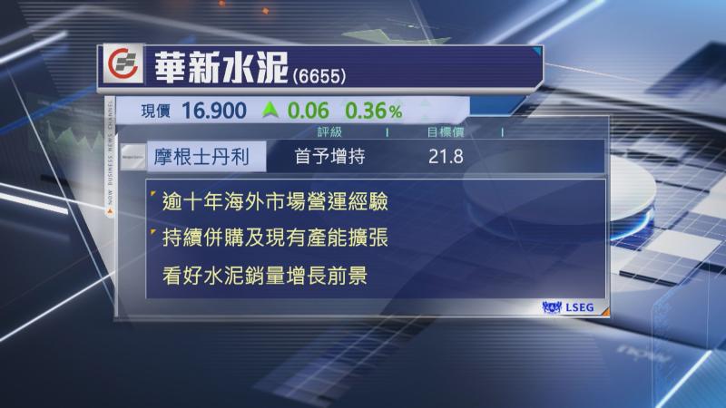此外,大摩首次給予華新水泥H股「增持」評級,目標價21.8元,並指集團有逾10年海外市場營運經驗,依靠持續併購如早前收購尼日利亞水泥及混凝土業務,以及現有產能擴張,看好銷量增長前景強勁,該行又指,華新水泥海外業務佔比大,盈利能見度高,認為估值吸引。