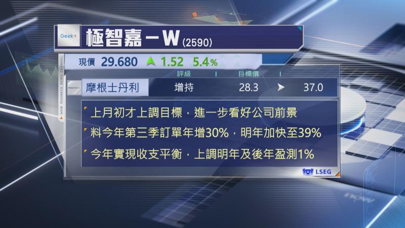 大摩上月初才上調集團目標價,該行進一步看好公司在倉儲解決方案的領導地位,相信未來繼續受惠於自主移動機械人產品增長,令市場地位得到鞏固,預期極智嘉今年第3季定單按年增長30%,明年增長將加快至39%。