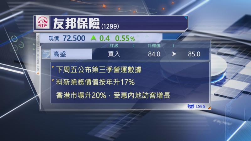 友邦將於下周五(31日)公布第3季營運數據,高盛估計,以實質匯率計的新業務價值按年增長17%至13.53億美元,而主要業務地區普遍錄得雙位數增長。