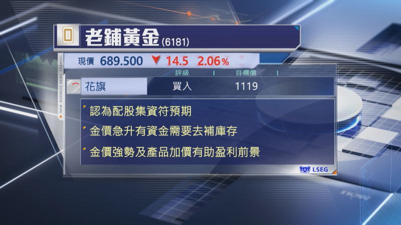 老鋪黃金折讓配股集資約27億元,將用於增加存貨儲備,花旗認為,集團配股集資符合市場預期,由於過去數月金價急升,集團的確有資金需要。