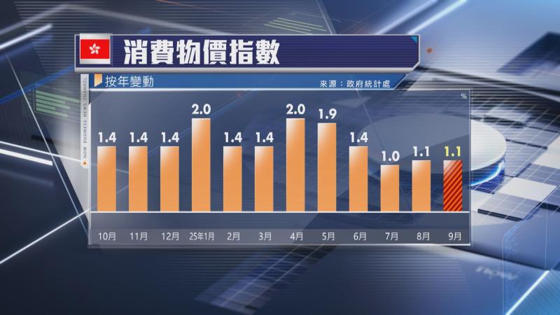 9月綜合消費物價指數(CPI)按年升1.1%,跟8月持平,剔除所有政府一次性紓困措施影響,基本通脹率1%,略低於8月。