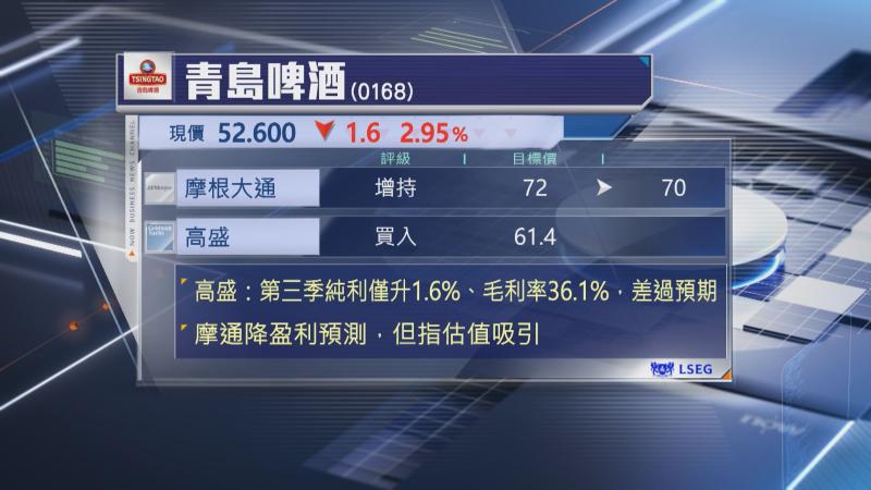 青啤第3季賺13.7億元人民幣,按年增長1.6%,高盛表示,增長遠低於預期的9%,又稱對啤酒銷量僅微升0.2%,平均售價跌0.5%感到意外,更拖累毛利率僅輕微改善至36.1%,低於該行預期。