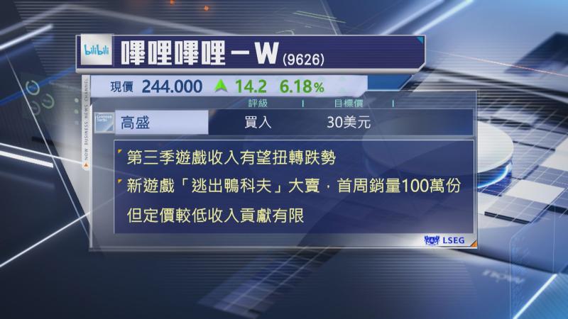B站方面,高盛預期,第3季遊戲收入有望扭轉跌勢,並持續改善至明年,旗下新遊戲《逃離鴨科夫》大賣,首周銷量突破100萬份,最高同時在線人數逾30萬人,雖然因為遊戲定價較低,收入貢獻有限,估計僅逾5000萬元人民幣,但旗下產品取得成功,可成為未來推出新遊戲的參考。