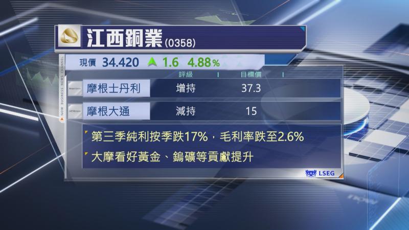 【Now財經台】江西銅業股份(00358)第3季賺18億元人民幣,按年升35%,按季倒退17%,大行指,差過預期。