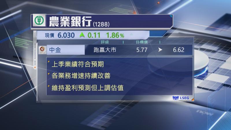 中金指農行上季業績符合預期,首3季營收及淨利分別增長2%及3%,非利息收入升幅較大,升超過30%,淨手續費收入有逾10%增長。首3季淨利息收入亦較上半年有改善。