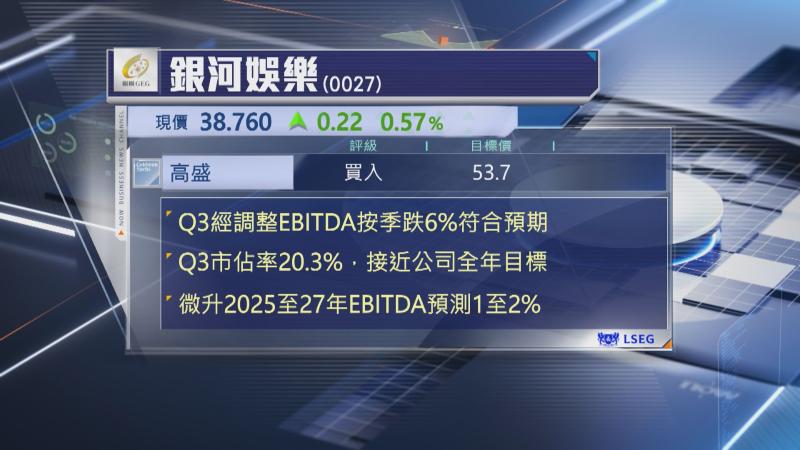 不過高盛指,銀娛市佔率穩定,上季博彩收入市佔率達20.35%,接近21%的全年目標價,有信心公司第4季的經調整EBITDA按季會回升,又輕微調高對公司2025至27年EBITDA預測1%至2%,維持「買入」評級,目標價53.7元不變。