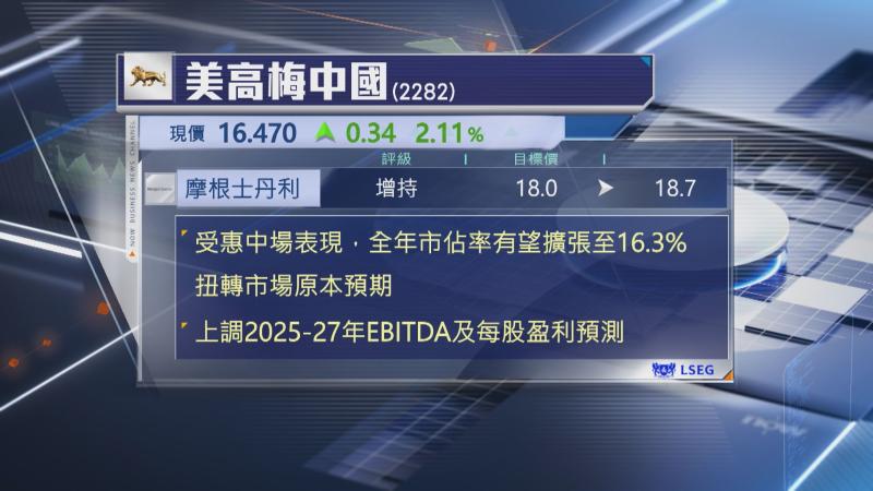 大摩估計,美高梅的中場市佔率由去年約15.8%升至今年的16.3%,扭轉市場原本預期集團今年或失去部分市佔率的預測,相信隨著市佔率提升,將帶動經調整撇除利息稅項、折舊及攤銷前盈利(EBITDA)有好表現,因此,上調2025至2027年EBITDA預測2%至50%,並調高每股盈利預測3%至7%。
