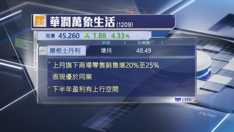 【Now財經台】摩根士丹利看好華潤萬象生活(01209)旗下商場銷售持續優於同業。