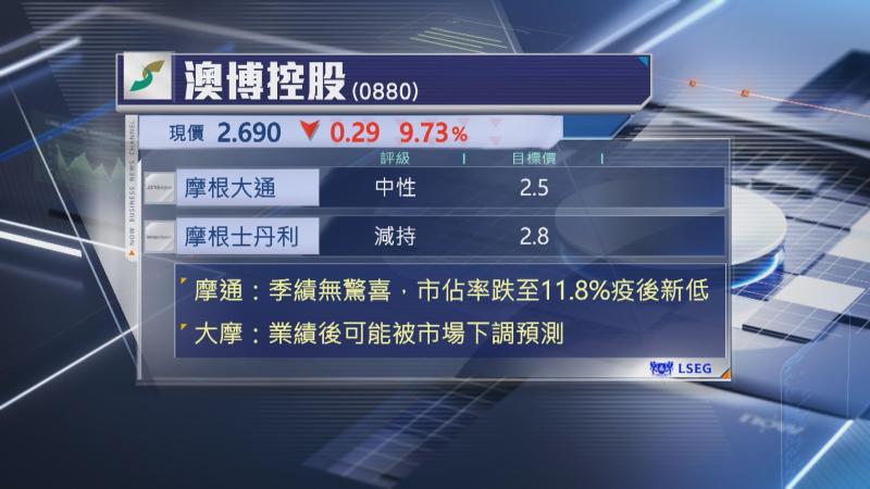 摩根士丹利則對澳博前景看法偏淡,估計業績後或會被市場下調預測,不過,大摩亦未有調整澳博目標價及評級,目標價繼續看2.8元,維持「減持」評級。