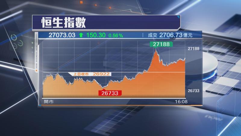 【Now財經台】本港股市4連升,恒生指數相隔逾1個月,收市再度企穩27000關。此外,恒指4日累升逾830點。