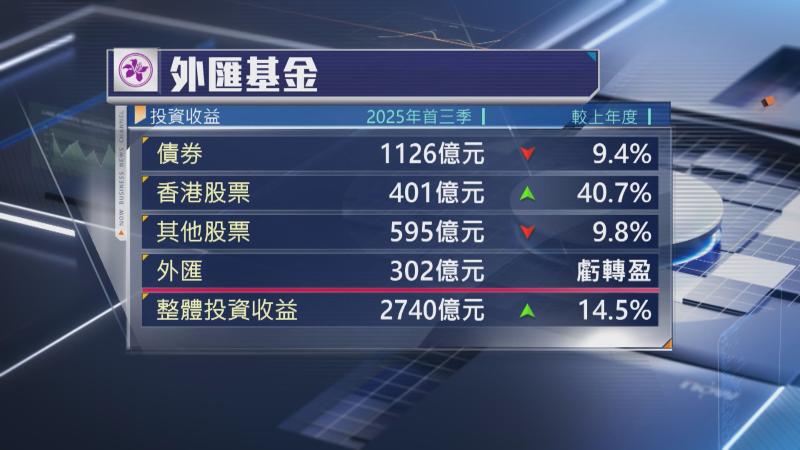金管局公布,截至9月底止首3季,外匯基金投資收入2740億元,增長14%,其中,債券投資收益1126億元,跌9%,港股投資收益大升40%至401億元,其他股票收益則減少近10%。