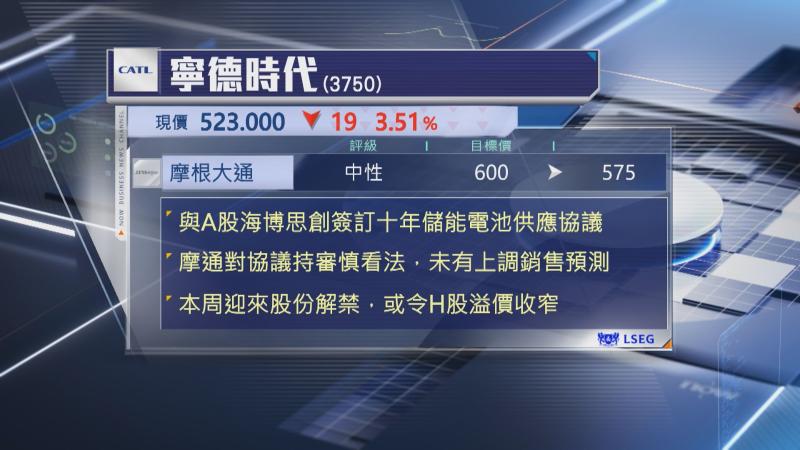 此外,摩通又提醒,寧德時代本周將迎來股份「解禁」,雖然中國石油化工股份(00386)、起亞等策略投資者出售持股機會較低,但股價仍有機會捱沽,下調目標價主要反映H股溢價或因股份「解禁」因素而收窄。
