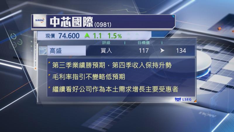 中芯第3季業績勝預期,根據集團最新指引,高盛估計,第4季收入將保持上升趨勢,但毛利率指引維持不變,就略低於預期,短期增長動力包括行業出現洗牌、本土客戶出貨量增加、產能擴張,以及設備使用率維持於高水平等。
